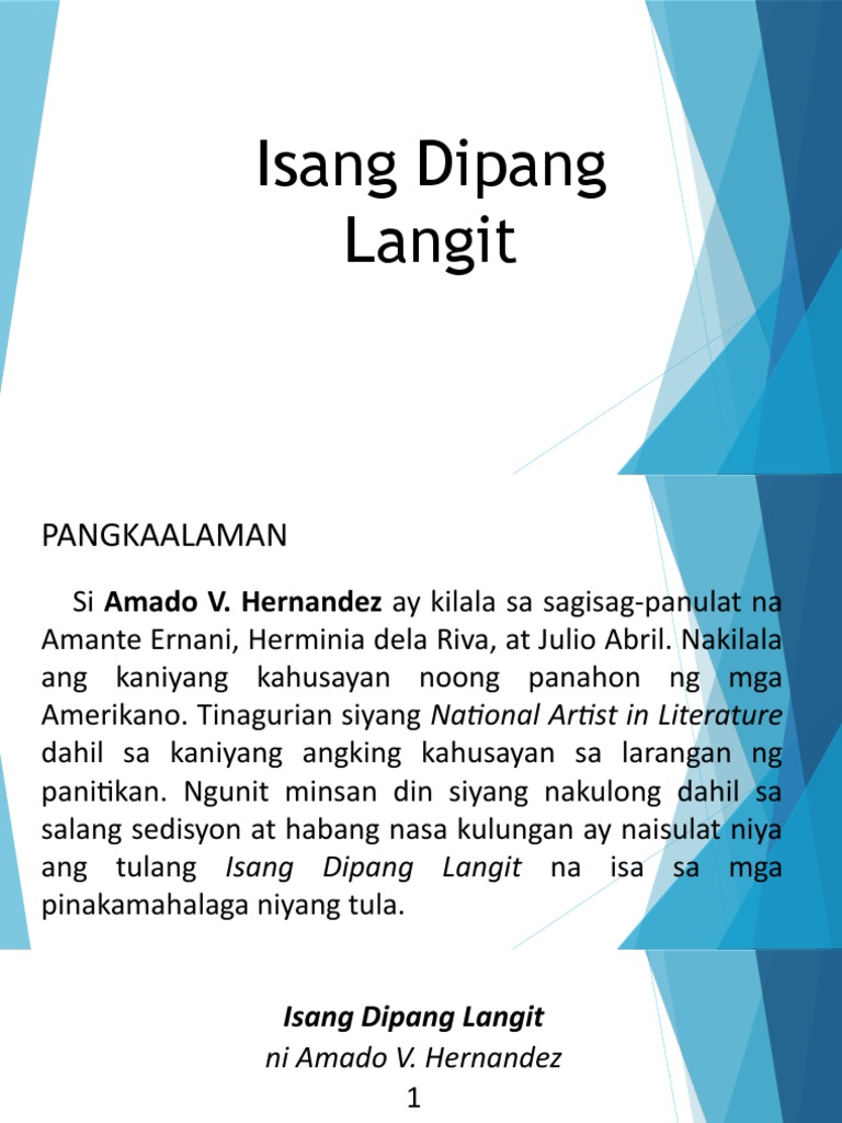 But first lets have a brief background about the writer. Isinulat ito ni Hernandez sa Muntinlupa noong Abril 22 1952. Isang Dipang Langit ni Amado V.