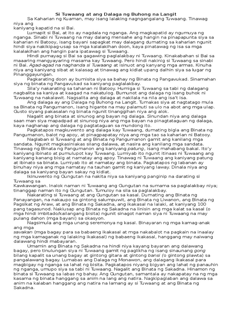 Mamili ng isa sa mga isyung nakasulat sa kahon na maaaring napanood sa telebisyon at social media o napakinggan sa. Ang magkapatid ay ngumuya ng nganga. Buod ng tuwaang at ang dalaga ng buhong na langit Send to Messenger Sagot Natanggap ni Tuwaang mensahe na siya ay pinadadalo sa isang kasal ng Dalaga ng Monawon.