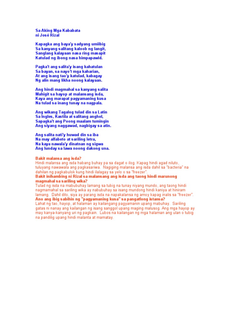 - is to provide support to would be to provide support for. Jose Rizal Sa Aking mga Kababata kung saan ibig niyang ipahiwatig ang kahalgahan ng salitang mismong nanggaling sa ating bayan o sarili nating wika. Anak-dalita Mahirap na tao pulubi.